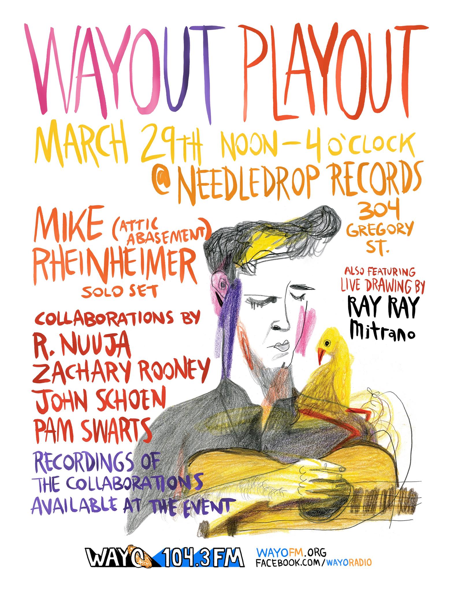 On Sunday, March 29th WAYO 104.3 FM and NeedleDrop Records are teaming up for an unique event benefiting WAYO! During the afternoon two original 15 minute pieces will be created live in the store by R. Nuuja, Zachary Rooney, John Schoen, and Pam Swarts and recorded by Joe Tunis! The two songs will be available on CD at the event for a donation to WAYO and come packaged in a cardboard sleeve featuring art by Ray Ray Mitrano drawn right on the sleeve! Plus, Mike Rheinheimer of Attic Abasement caps off the afternoon with a headlining solo set!